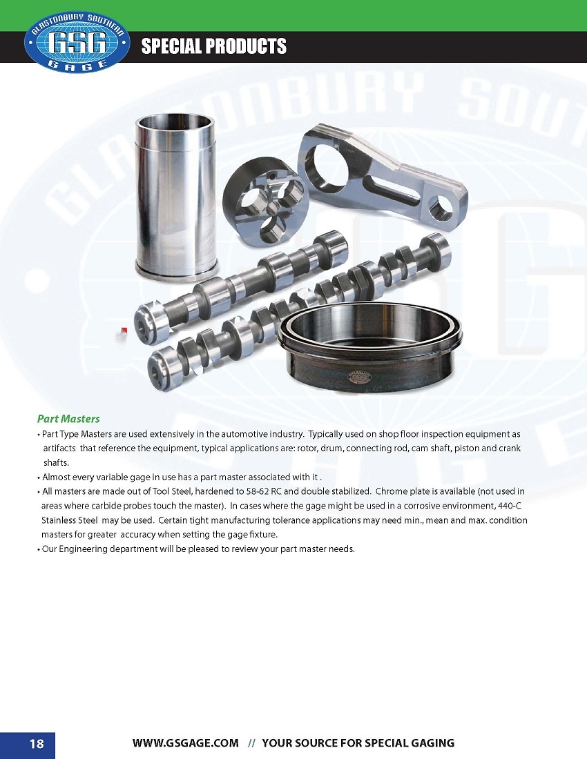 GSG全称是Glastonbury Southern Gage,是美国最大的非标量规、工装家具制造商,可以生产各类标准件、CLASS:XXX级的光面环塞规、UNJ航空螺纹量规、MJ米制航空量规、API石油螺纹量规、HBPV螺纹塞规/BPV螺纹环规、Sharp Vee螺纹规、TBG/UPTBG螺纹规、NC螺纹规、REG螺纹规、IF螺纹规、FH螺纹规等,美标AGD可调式螺纹环规、ANPT螺纹规、NPTF螺纹规、PTF SAE Short螺纹规、GSG螺纹指示规、GSG螺纹中径量仪。