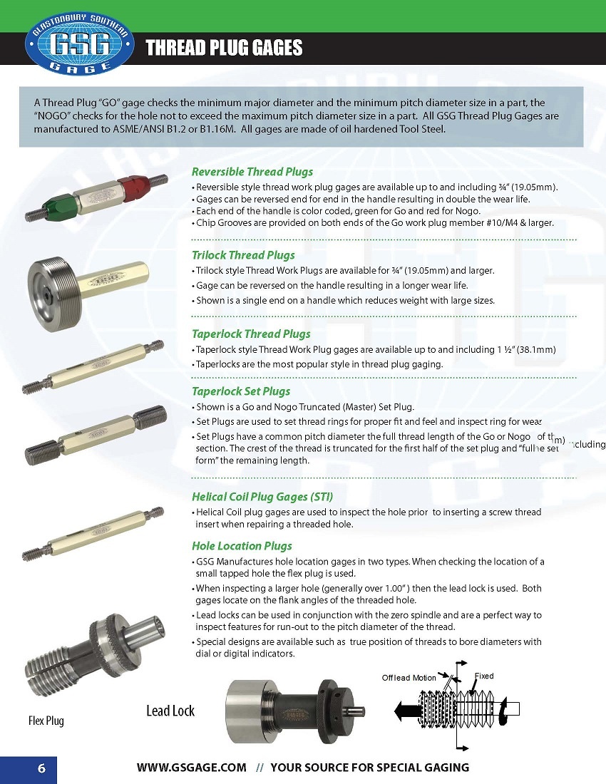 GSG全称是Glastonbury Southern Gage,是美国最大的非标量规、工装家具制造商,可以生产各类标准件、CLASS:XXX级的光面环塞规、UNJ航空螺纹量规、MJ米制航空量规、API石油螺纹量规、HBPV螺纹塞规/BPV螺纹环规、Sharp Vee螺纹规、TBG/UPTBG螺纹规、NC螺纹规、REG螺纹规、IF螺纹规、FH螺纹规等,美标AGD可调式螺纹环规、ANPT螺纹规、NPTF螺纹规、PTF